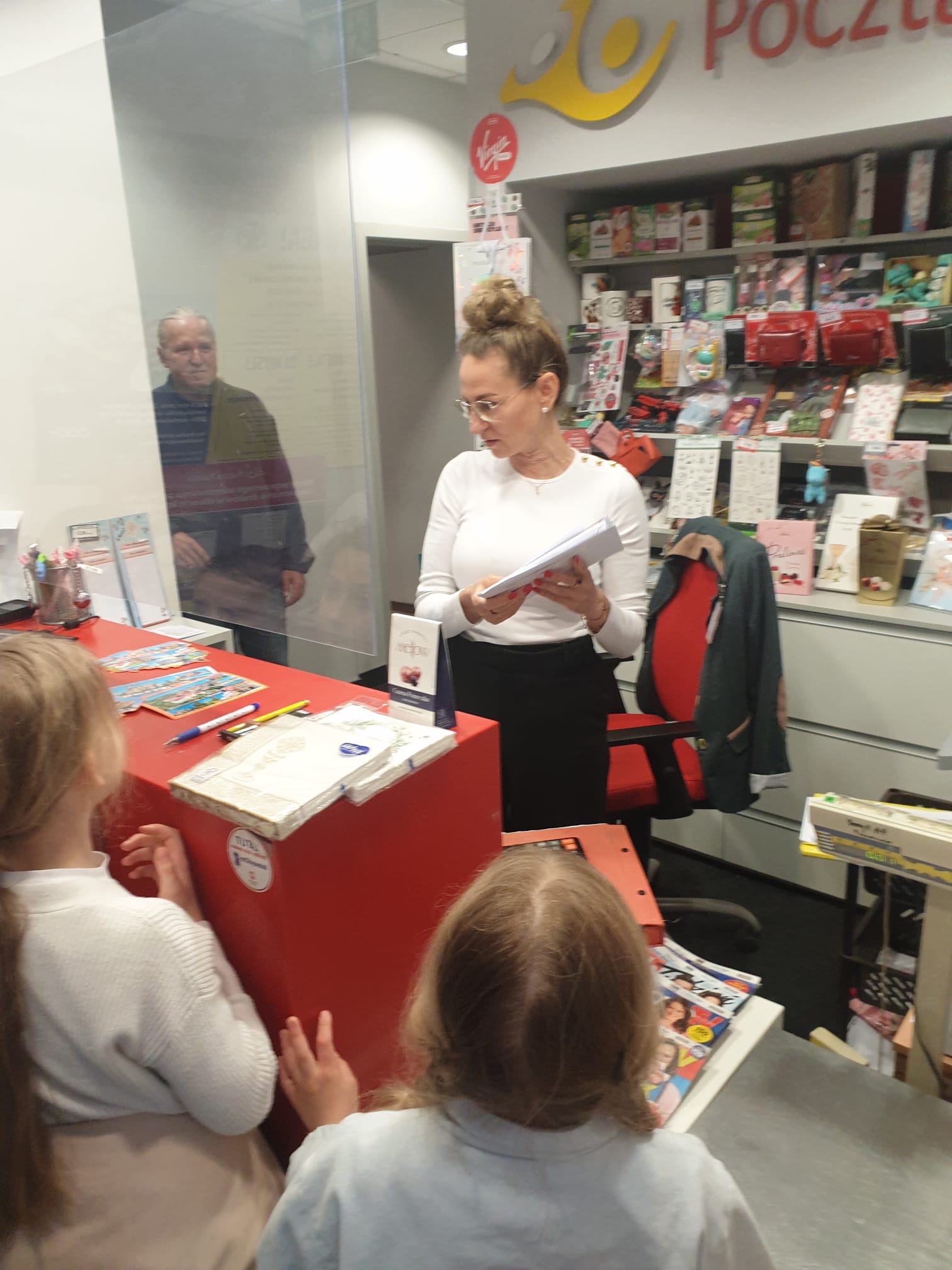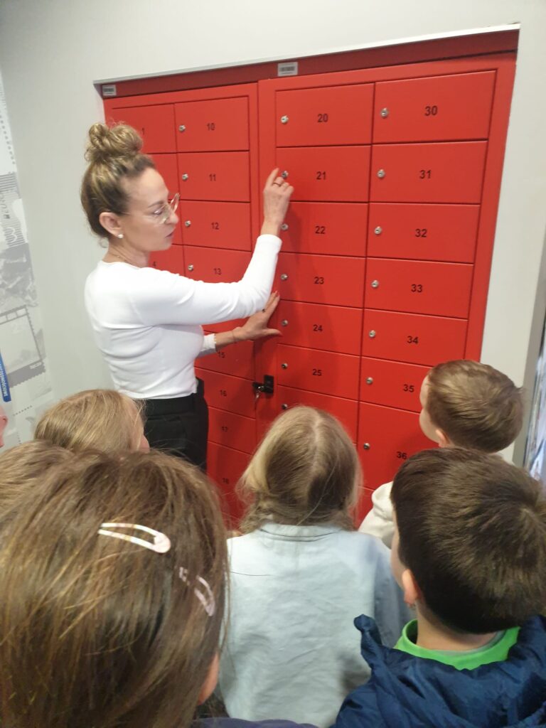 Na miejscu przywitała nas przemiła Pani, która opowiedziała o swojej pracy i zdradziła kilka pocztowych ciekawostek 📦✉️ Dzieci słuchały z ogromnym zainteresowaniem. Wyjaśniła dzieciom, jak wygląda codzienna obsługa klientów, na czym polega przyjmowanie i wydawanie przesyłek oraz jak ważna jest dokładność i odpowiedzialność w tym zawodzie. Dzieci dowiedziały się również, że każdy list musi być odpowiednio zaadresowany i oznaczony znaczkiem, aby mógł trafić do właściwego odbiorcy oraz jak waży się paczki i oblicza koszt ich wysyłki. Dzieci mogły zobaczyć różne rodzaje przesyłek oraz dowiedzieć się, czym różni się list zwykły od poleconego. Szczególnie zainteresował je proces sortowania listów i to, jak trafiają one do różnych miejsc w kraju i na świecie.