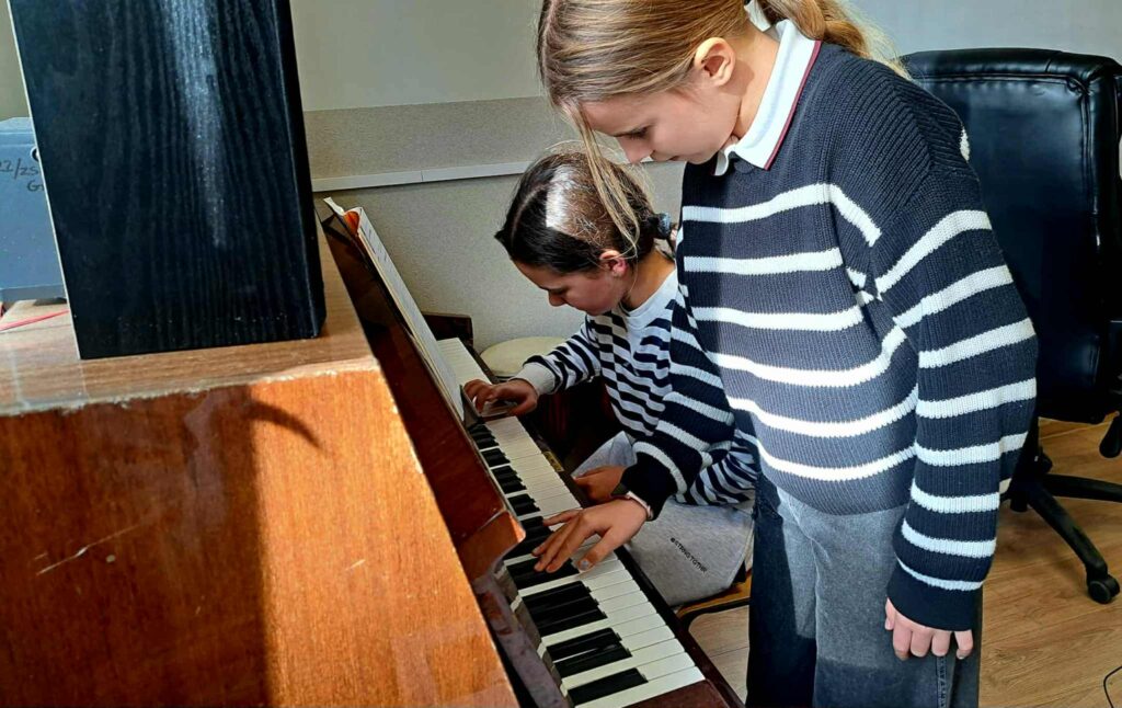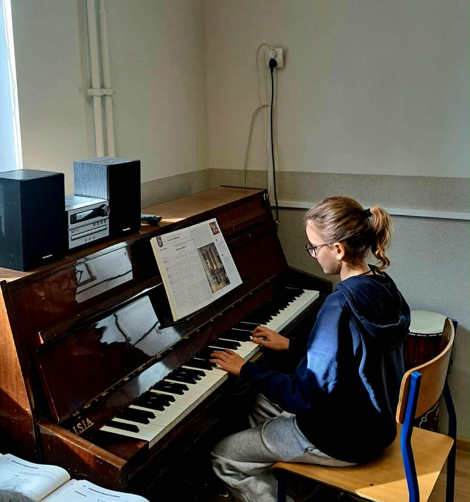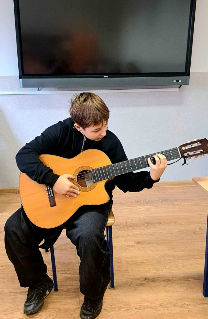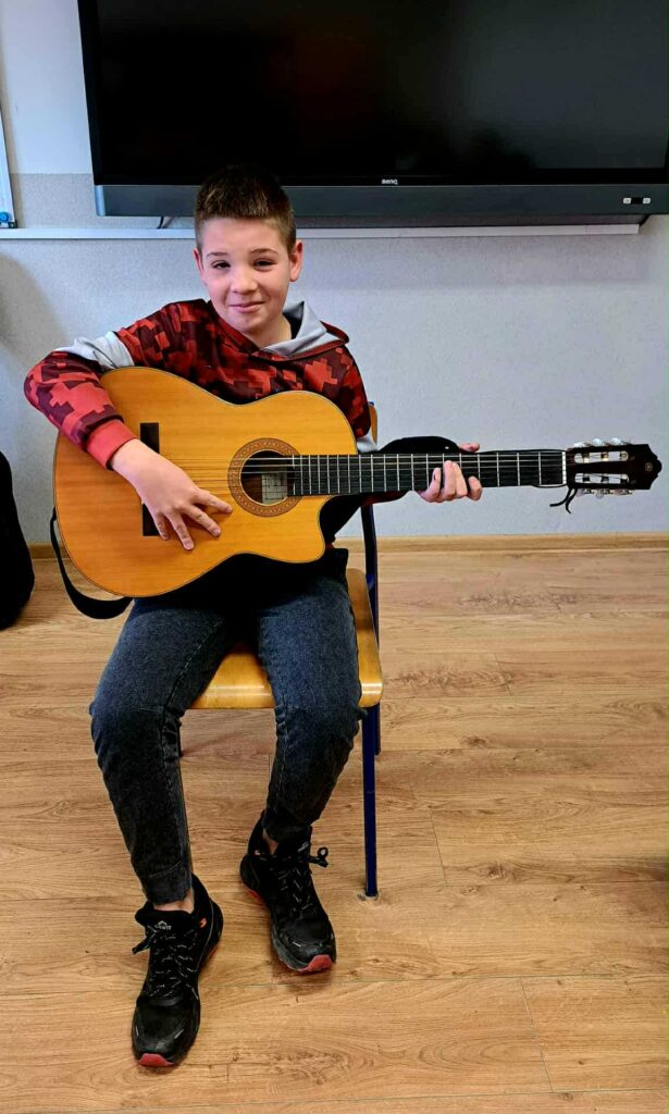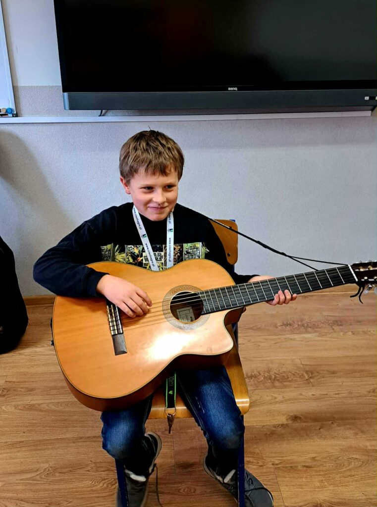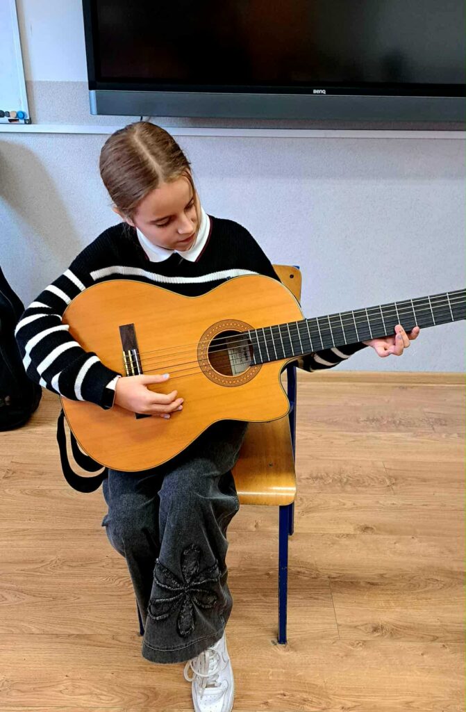 Dziś wraz z promieniami jesiennego słońca do sali muzyki zawitała królowa instrumentów – gitara. Podczas poznawania rodziny chordofonów, czyli instrumentów strunowych uczniowie klasy 5a mogli zaprezentować swoje umiejętności gry na tym subtelnym instrumencie, a także spróbować po raz pierwszy doświadczyć i poczuć jak ciepełe jest brzmienie strun. Mamy nadzieję, że rozbudzi to w nich pragnienie rozpoczęcia przygody z tym pięknym instrumentem. Z racji, iż w tej samej rodzinie instrumentów znajduję się pianinio, uczniowie uczęszczający do szkoły muzycznej, mogli zaprezentować całej klasie piękne brzmienie pianinia i swoje umiejętności gry na tym dostojnym iinstrumencie. Cieszymy się, że doświadczenie gry na instrumentach daje naszym uczniom tyle radości.