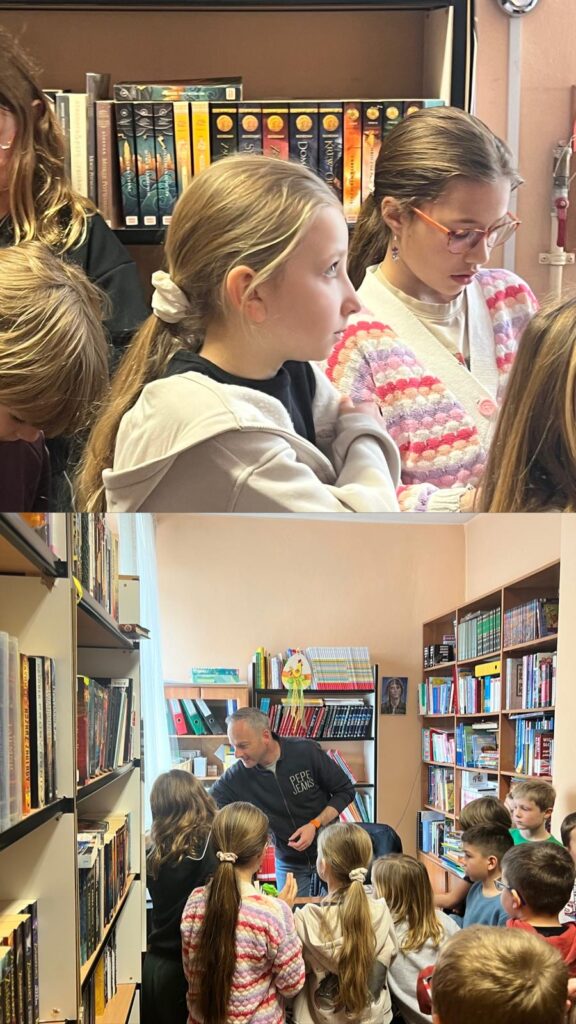 Podczas wizyty dzieci spotkały się z panem Szymonem Gancarczykiem, który w bardzo przystępny i interesujący sposób opowiedział o tym, jak powstaje książka. Uczniowie dowiedzieli się, ile pracy i zaangażowania wymaga stworzenie publikacji – od pomysłu autora, przez proces pisania i redagowania, aż po druk i trafienie książki na półki biblioteczne.