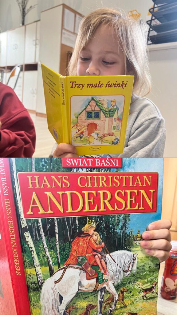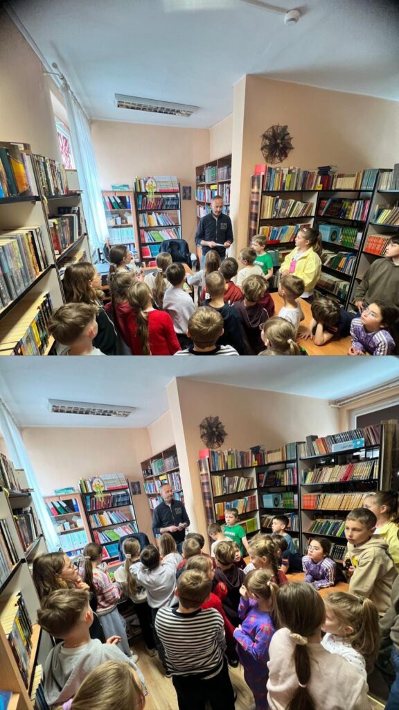 Pan Szymon podzielił się również wieloma ciekawostkami związanymi z książkami oraz pracą w bibliotece. Opowiadał o tym, jak dbać o książki, jak korzystać z zasobów bibliotecznych oraz dlaczego warto regularnie odwiedzać bibliotekę. Zachęcał dzieci do sięgania po różnorodne książki, rozwijania swoich zainteresowań i odkrywania nowych światów ukrytych na kartach literatury.